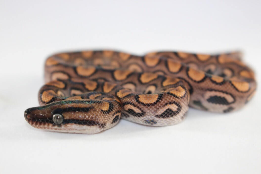 The iridescence is present from birth but is most visible under direct, bright light. It becomes significantly more pronounced and noticeable under normal room lighting after several sheds, typically becoming a dominant feature by the time the snake reaches sub-adult size.